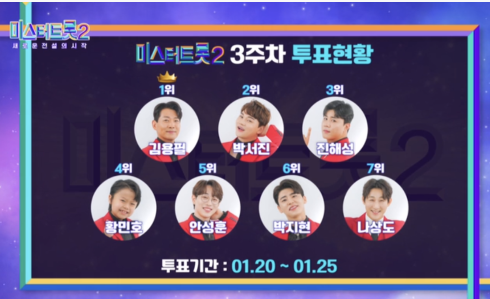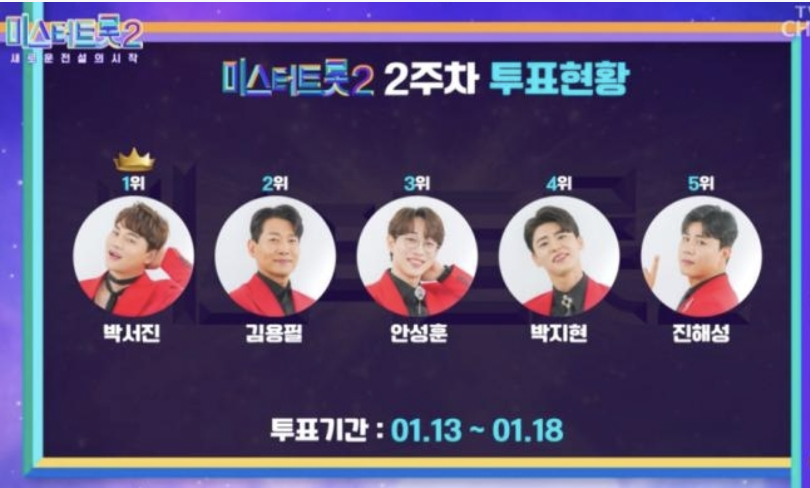 누적 560만 표를 돌파하며 파죽지세 행진을 이어가고 있는 온라인 응원 투표의 3주 차(1/20~1/25) 결과는 ‘낭만 가객’ 김용필이 어마어마한 중년 파워로 ‘막강 팬덤’ 박서진의 아성을 무너뜨리는 기염을 토하며 1위를 차지했습니다.